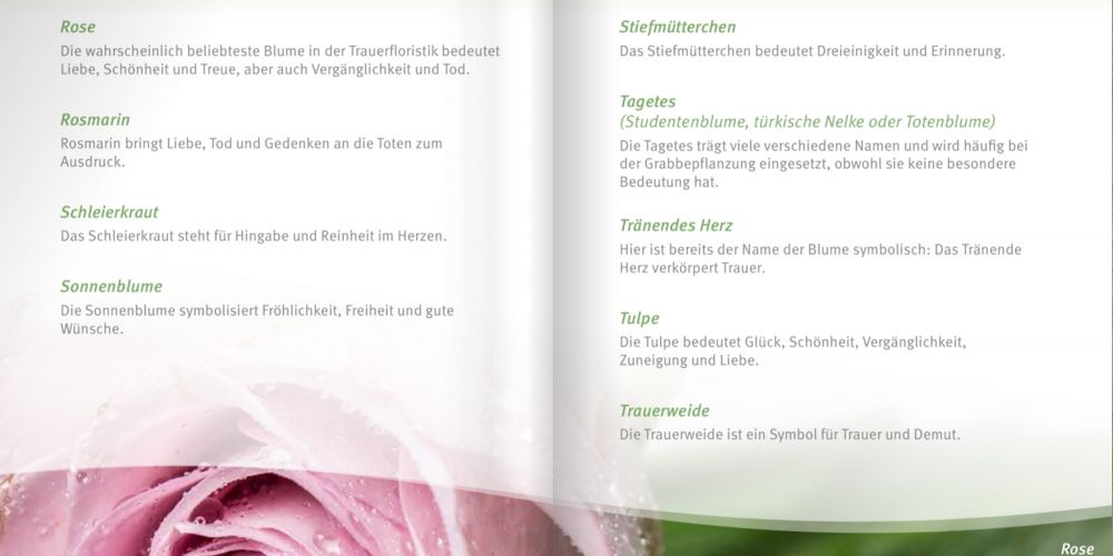 Zwar sind bei der Blumen­wahl für Kränze, Sarg- oder Urnen­schmuck und Grab­be­pflan­zung meist die eigenen Vorlieben oder die des Verstorbenen aus­schlag­gebend, dennoch lohnt sich ein Blick auf den Symbol­charakter der einzelnen Arten.